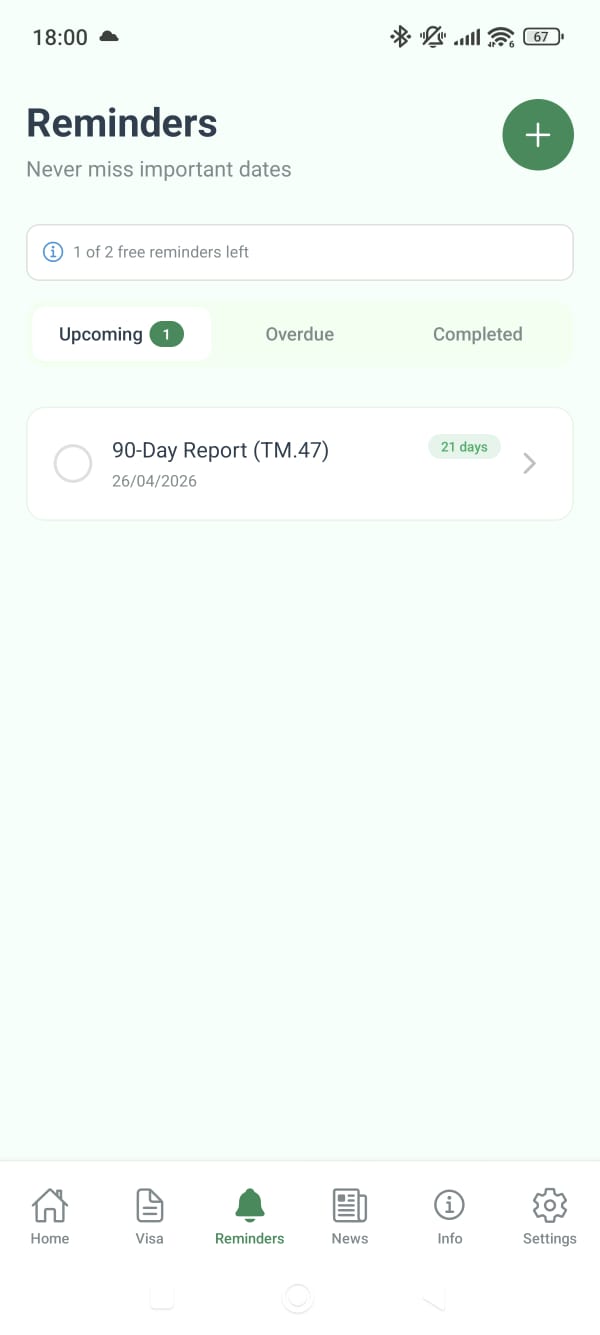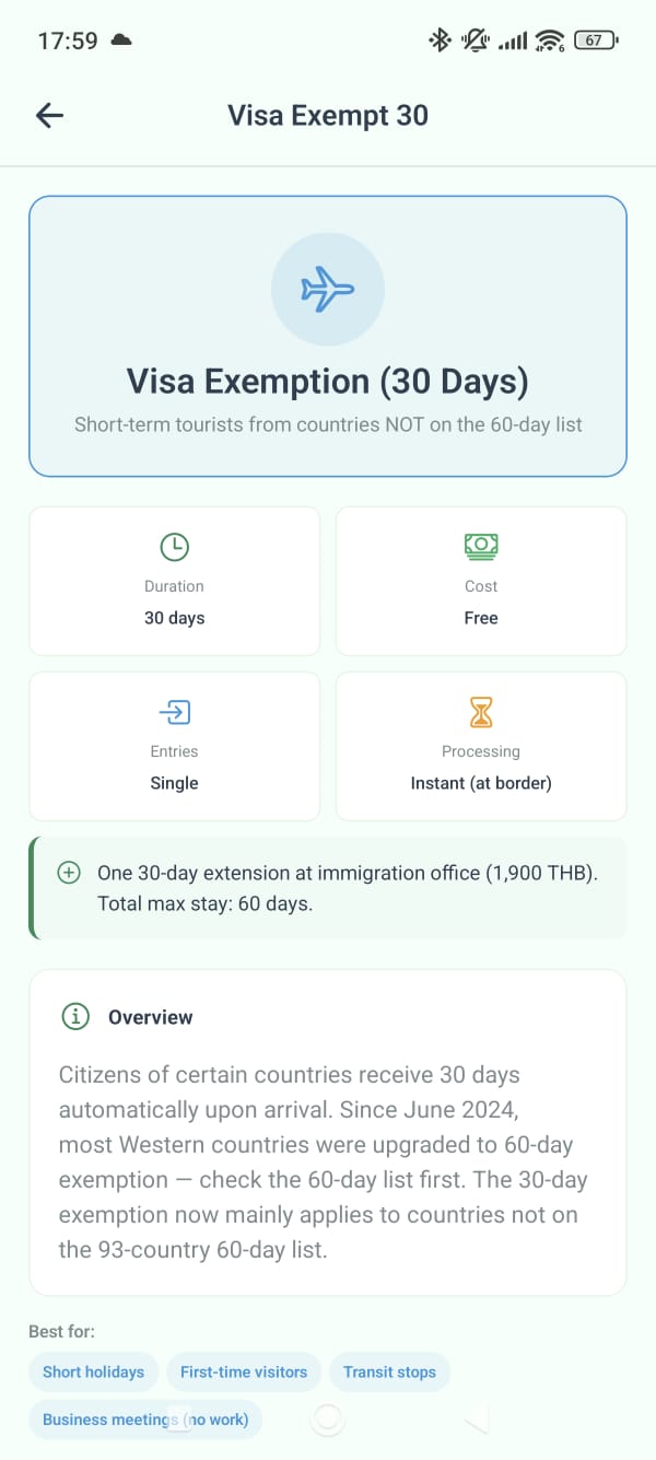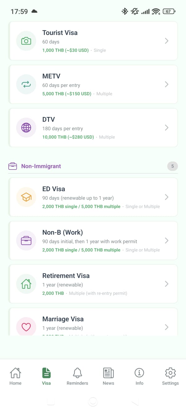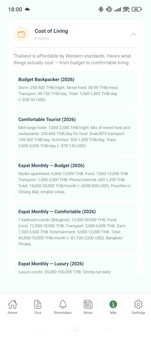 Sticky alerts for visa deadlines, overstay calculator (500 THB/day), auto-renewal reminders